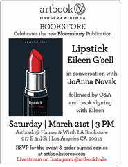 LACY SOTO | DATE 3/21/2026Saturday, March 21, from 3–5 PM PST, Artbook at Hauser & Wirth Los Angeles presents writer Eileen G’sell in conversation with writer and publisher JoAnna Novak for the Los Angeles book launch of 'Lipstick.' Lipstick today is as messy—and fascinating—as changing attitudes towards femininity. Mining the experience of women across culture, class and generation, this book tosses out expired ideas about beauty and power like so many tubes of melted wax. Conversation, followed by a signing.