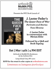 LUCIA ZEZZA | DATE 3/14/2026Saturday, March 14, at 4 PM, Artbook at MoMA PS1 Bookstore presents a conversation between award-winning photographer and journalist J. Lester Feder and Miriam Elder, Executive Editor Features at CNN, for the New York City launch of 'The Queer Face of War: Portraits and Stories from Ukraine.' Followed by a Q&A and book signing.