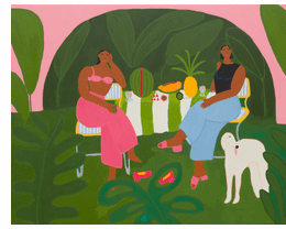 CORY REYNOLDS | DATE 3/1/2026 Celebratory and serious, Let Us Gather in a Flourishing Way: Contemporary Latinx Painting opens this week at the Buffalo AKG Art Museum. Curated by Andrea Alvarez and representing the work of 58 Latinx artists based throughout the United States and Puerto Rico, it is a timely overview that “offers an antidote to the multiple forces that today pull people and cultures apart,” in the words of AKG Director Janne Sirén. Pictured here: “Garden Club” (2024) by Chicago-born, Okemos, Michigan-based artist and entrepreneur Lilian Martinez. Her specialty? Figures engaged in radical acts of everyday leisure. From the bilingual catalog.