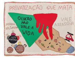 JACK TEEHAN | DATE 3/8/2026 Created by a consortium of Brazilian women united under the Coletivo Nacional de Mulheres do Movimento dos Atingidos por Barragens (MAB) umbrella, arpilleras—Spanish for burlap, or scraps of fabric embroidered on jute—became a language of female agency during the Pinochet regime. Primarily created by mothers, wives and relatives of political prisoners, these works depict scenes of everyday life, repression and the struggle for rights. This 2019 arpillera, titled Privatização que mata [Privatization That Kills] and produced by women from the state of Pará, depicts a scene of chaos. A large green triangle dominates half the composition, an oblique reference to the Brazilian mining company Vale, infamous for two catastrophic dam failures: Mariana, in 2015, and Brumadinho, in 2019. Embroidered on top of the logo is the MAB slogan “O lucro não vale a vida [Profit is not worth life].” Blood drips off of the logo, down to the earth below, where a post-traumatic maelstrom plays out in the mud. A helicopter hovers above, searching for missing bodies among the scene of devastation. Groups of protestors surround the appliqué, holding placards featuring messages such as “LUTO e RESISTENCIA” to express their outrage and demands for justice. “For many people, the arpillera may seem like just a piece of art to hang on the wall. For us, the political significance of this textile testimony lies in the organization of women, in the fight for their rights and in the political proposition—of dreams, of utopias, of what we long for. It’s a denunciation, but it’s also a project of hope,” writes Daiane Höhn, a MAB activist.