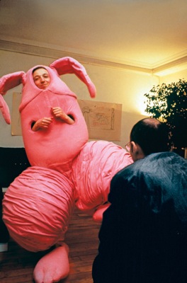 One such chain of production revolved around performative actions involving Cattelan’s dealers, who over the years were incorporated into artworks, put on display, and mocked if not exploited. The first incarnation of this scheme took place in 1993 at Galleria Raucci/Santamaria in Naples, when the artist convinced the two owners, Umberto Raucci and Carlo Santamaria, to wear full-body lion costumes in the gallery for the duration of his solo exhibition. Their presence constituted a live piece entitled Tarzan & Jane (cat. no. 19), the only work on view, which Cattelan recorded in a group of photographs. Similarly, for the duration of his 1995 solo exhibition at Galerie Emmanuel Perrotin in Paris, he persuaded Perrotin to don a costume he commissioned from the designers at the renowned Italian film studio CineCittà. Looking like a cross between a rabbit and a giant phallus, the hot pink costume poked fun at Perrotin’s reputation as an inveterate womanizer. Titled Errotin, le vrai lapin (Errotin, the true rabbit), with a punning wit reminiscent of Duchamp, the exhibition also included humorous cartoons of the hybrid bunny in action, which Cattelan had commissioned from Italian comics artist Umberto Manfrin to accompany the performance. While there were these tangible objects for sale (albeit only in the back room of the gallery), the show fundamentally comprised the artist’s incisive realignment of the power structure between artist and gallerist. In particular, Perrotin’s sexualized performance recalled a time when artists like Vito Acconci, Chris Burden, VALIE EXPORT, and Gina Pane used their respective galleries to present various manifestations of body art during the 1970s. Acconci’s explicit eroticization of the space in Seedbed (presented at Sonnabend Gallery, New York, in 1972) is an apt comparison, especially since Cattelan included faux ejaculate stains on Perrotin’s walls. But rather than exposing himself, literally or figuratively, he forced his dealer into the spotlight, who took the kind of risk usually reserved for the exhibiting artist.