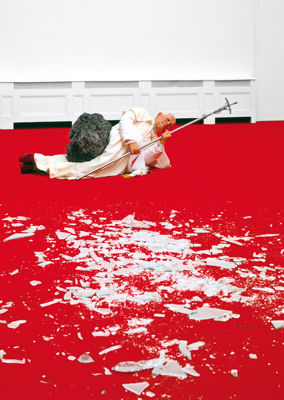 Cattelan’s targets have not always been art related; he attacks ecumenically, striking wherever he perceives inflated authority. In his sensationalist sculpture of Pope John Paul II felled by a meteorite, La Nona Ora (The ninth hour, 1999, , cat. no. 68), the artist fulfills the dual meaning of the word iconoclast, both as someone who challenges tradition, seeking to break the stronghold of power, and as someone who destroys religious images in opposition to the worship of false idols. Created on the occasion of his solo exhibition at the Kunsthalle Basel, La Nona Ora is perhaps the artist’s most incendiary work, touching multiple cultural and religious nerves. It is also his most theatrical. Set on a regal red carpet and surrounded by shards of broken glass—the residue of a skylight broken by the plummeting meteorite—the pope lies inert on the ground bearing the weight of the celestial stone. A strikingly real portrait of the then-reigning pontiff, the figure is dressed in full ceremonial regalia, ferula in hand. His face shows both pain and confusion, pure shock at the extraordinary incident that has just occurred. The title, like that of the little Pinocchio, Daddy, Daddy, refers to the moment on the cross when Christ calls out to his father in anguish. Cattelan’s dramatic mise-en-scène elicited cries of blasphemy and, like the hanging boys cut down from a tree by an enraged passerby a few years later, the sculpture was vandalized by outraged viewers. When on view at Warsaw’s Zachęta National Gallery of Art in the pope’s native Poland, two right-wing members of parliament attempted to upright the fallen figure, leaving a copy of a letter one had written to the prime minister demanding the dismissal of the museum’s director, Anda Rottenberg. Pointing to her Jewish origins, it accused her of spending state money—belonging, the logic went, to the country’s Roman Catholic majority—on offensive works of art and suggested that she relocate to Israel. Subsequently, ninety members of parliament issued another letter demanding that Rottenberg be immediately fired. Though the president of Poland, Aleksander Kwaśniewski, and two local priests tried to quell the controversy, proclaiming publicly that Cattelan’s sculpture functioned as an allegory for the “pope’s heavenly burden,” Rottenberg was forced to resign.
