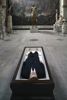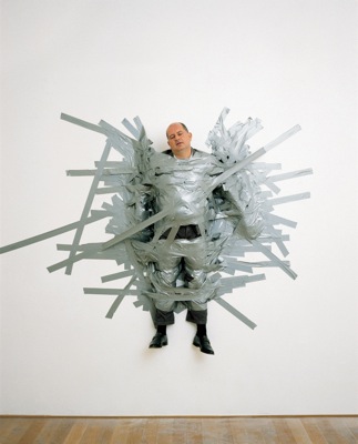 As a final act in this trilogy of “gallerist abuse,” Cattelan duct-taped Massimo De Carlo, his Milan dealer, to the wall in a DIY crucifixion. Martyred for the good of the business in an untitled performance (formerly titled, ambiguously, A Perfect Day, fig. 25) in 1999, De Carlo was rushed to the hospital before the end of the opening after losing consciousness from being suspended for so long. Despite any seeming hostility on Cattelan’s part in these works, the impulse behind the spirited efforts to create spectacles out of art dealers was not rooted in a condemnation of the gallery system. His work, like that of others of his generation, can be considered as post-institutional critique. His goal, in the spirit of artistic peers like Pierre Huyghe and Dominique Gonzalez-Foerster, is less to reframe and subvert the inherently reifying powers of a museum or gallery than to activate the exhibition environment, to create slippages between the aestheticizing space of art and the world at large in order to shed light on both. As with his faux 6th Caribbean Biennial or the earlier Working Is a Bad Job, Cattelan deliberately obscures where the art begins or ends, allowing elements of the everyday to infiltrate the otherwise rarefied realm of the exhibition space, requiring a more dynamic engagement from the viewer than mere contemplation. “How can I contest the system if I’m totally inside it?” he asks. “I want benefits from this system. . . . I’m not trying to be against institutions or museums. Maybe I’m just saying that we are all corrupted in a way; life itself is corrupted, and that’s the way we like it.”