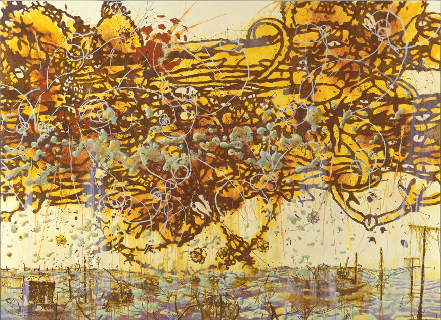Ezekiel’s words still ringing in my ears, I walk into the main room of the gallery to be engulfed by Ritchie’s light-suffused paintings and a black, folded latticework sky suspended above me. A painting on the end wall seethes with the gushing surge of a crackling brown network of sharp lines and shapes interspersed with whiplash spirals of white and pointy shards of rust raining down on a hapless, possibly sinking ship. Paint as rage, rage precisely calculated, engulfs the plane. We Leave Today, this expanse of almost twelve feet is titled. “Too late,” I think, as I’m drawn evermore into this cruel beauty. Three more sagas of liquid violence roil the long side wall of the gallery. God of Catastrophe pulses with circular detonations, the largest of which has sucked a boat out of the waters below; one can see a ring of eyelike shapes that recall Ezekiel’s prophecy as well as the rings of eyes found in William Blake’s similarly themed The Whirlwind: Ezekiel’s Vision of the Cherubim and Eyed Wheels (1803–05). The other two paintings in the exhibition, We Will Not Be the Last and Personal Virtue, are no less enflamed with apocalyptic skies wreaking havoc on the waters below.